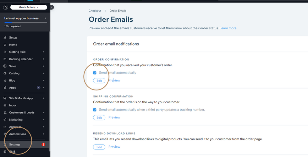 From the left hand menu on your site Dashboard, select Settings then Checkout Settings, then Order Emails.